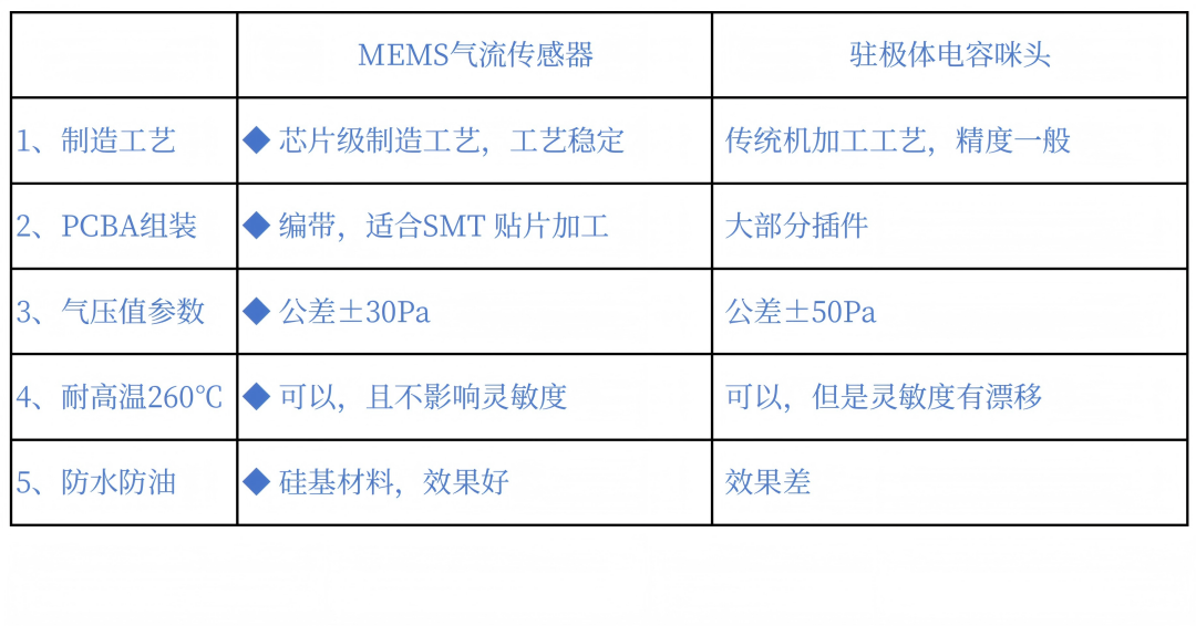 3) MEMS气流传感器和驻极体电容咪头的性能对比